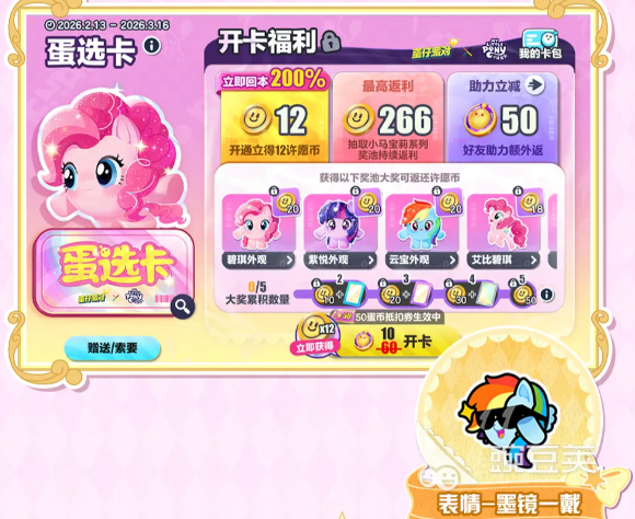 2月13日至2月16日开放小马宝莉蛋选卡预售通道;2月17日零点起,蛋选卡正式上架。单次开卡需消耗60蛋币,成功邀请好友助力可即时返还50蛋币;最低仅需10蛋币即可解锁基础权益。非最低价开卡后仍可继续邀请助力,未达最低门槛产生的差额将以蛋币形式100%返还至账户。