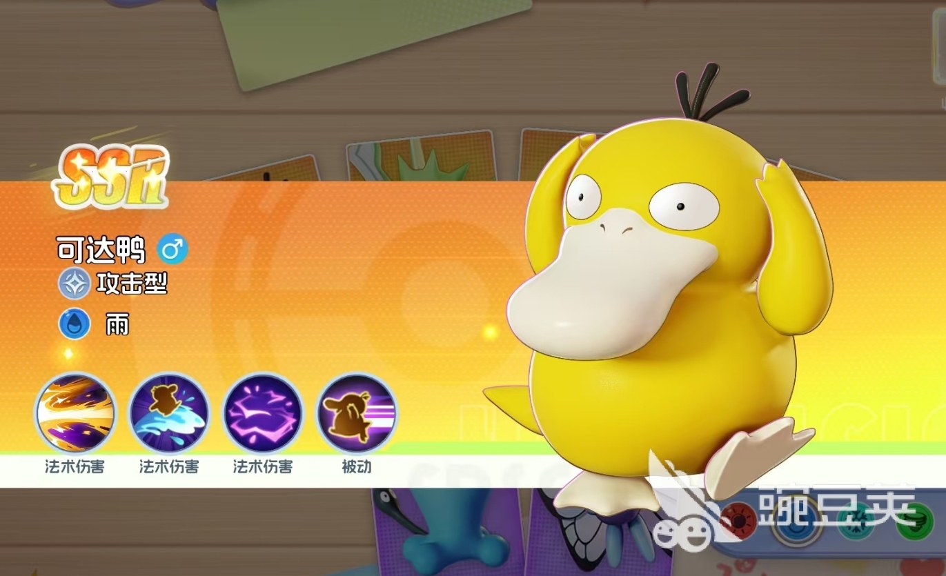 可达鸭是雨阵营中的一员,作为攻击型宝可梦的它以法术伤害为主,且所有主动技都能在释放时攻击到多名敌人。其大招为破坏死光,可瞄准距离自己最近的一名敌人发射,且不管死光是否命中目标敌人,它都会形成一条路径,任何处于死光路径上的敌人都将吃满大招的伤害。该技能初始别率就有570%,升满后伤害倍率更是会达到900%,伤害特别的夸张,死光的范围也较大,即便敌人刚好处于移动状态,也很难在可达鸭释放时走出死光的影响范围。