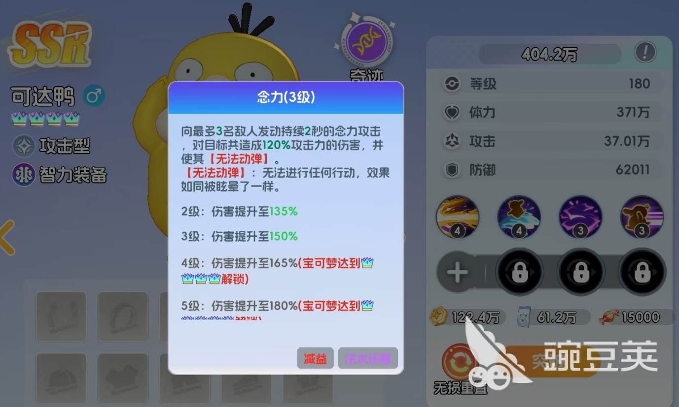 当可达鸭来到11级时,第二个技能冲浪也将解锁,释放时除了能对周边敌人造成伤害外,还会附带击退效果,令它们远离可达鸭。而且一旦有近战敌人攻击到可达鸭,还有40%概率能让可达鸭清除冲浪的CD并再次释放。41级时更会令可达鸭解锁一个很好用的控制技能念力,可达鸭能利用该技能对至多3名敌人施加无法动弹效果,令它们彻底定在原地,只能被动接受己方宝可梦的攻击,没办法还手。配合上61级解锁的被动悠然自如,可达鸭会在战斗时频繁地为敌人施加无法动弹效果,将战局主动权掌握在己方手里。
