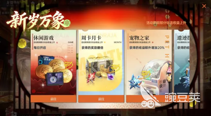 「新岁万象」属于常规收益提升板块,活动期间休闲游戏每天都会开启,周卡月卡奖励翻倍,部分玩法的收益也有所提高,这个不需要额外操作,平时怎么玩就怎么玩,奖励自然就多了。