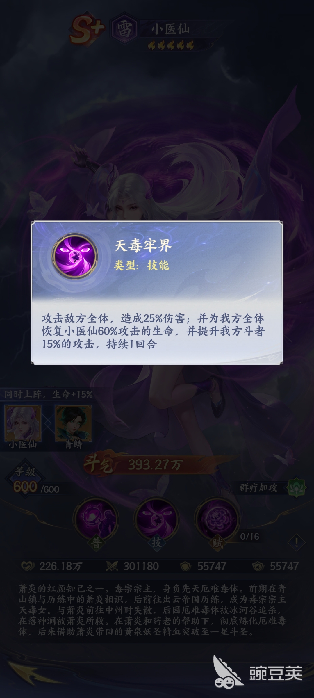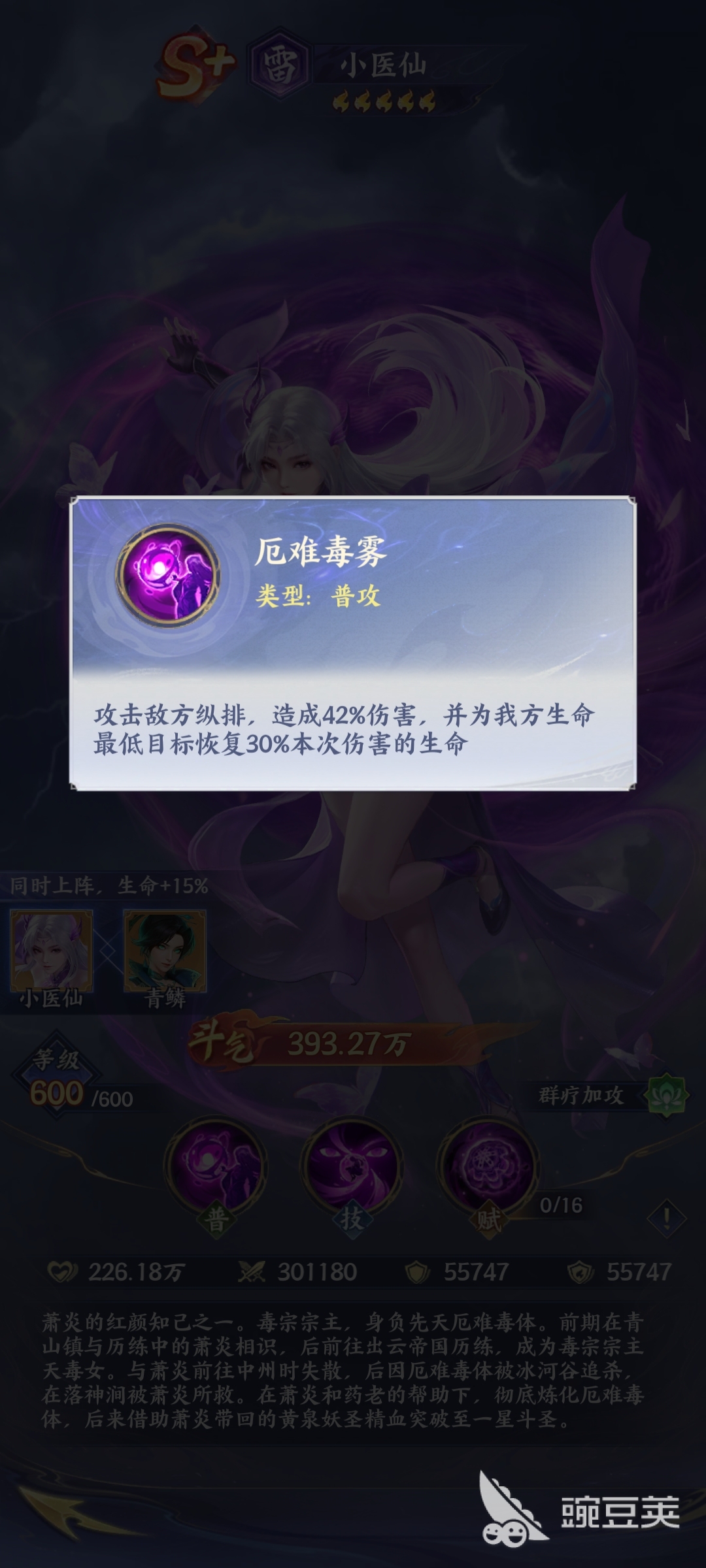 小医仙在斗破苍穹手游当中作为群疗加攻击类型的辅助,它其实又被定义为治疗跟输出增益,所以说玩家在合理利用小医仙的时候,首先需要了解他的普通攻击技能,那就是厄难毒雾。如果当小医仙已经成功的施展了这个技能之后,它可以有效地攻击敌人的纵排。并且此时此刻他还能够给自己队友最低的生命值起到回血的作用。