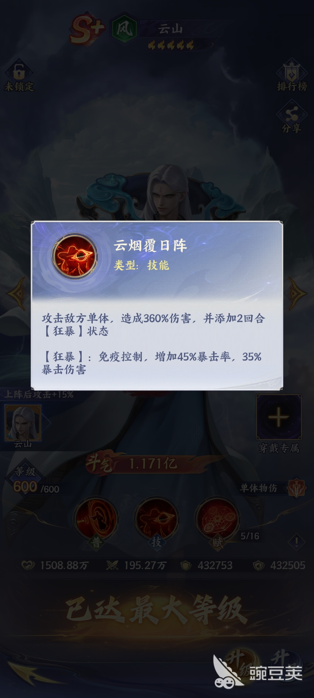 核心技能云烟覆日阵就成为他力量的一大体现,不仅可以针对单体造成360%的高额伤害,还可以给自己施加两个回合的狂暴状态。在免疫控制的同时,还能有效提升45%的暴击率,另外还可以提升30%的暴击伤害,让每一次的攻击都是特别可怕的。他的一生其实就是一场悲剧,曾经是守护者,可是在力量的诱惑之下,居然亲手摧毁整个宗门。而他是一个强大的角色,可是最终的悲剧也让人觉得有一些唏嘘,如果大家想要去体验一下,那也可以关注上面的内容。