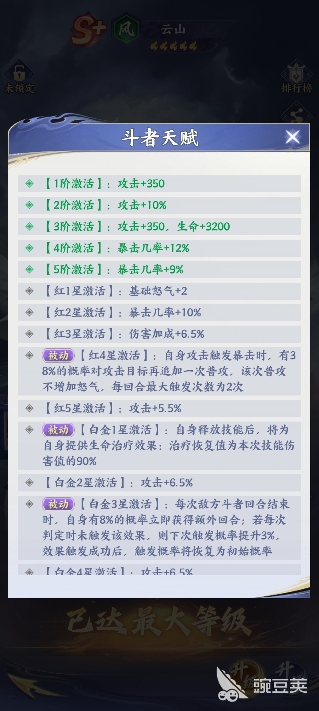 斗者天赋将极致输出,还有生存续航全部放在一起,从1阶到5阶,暴击率,还有攻击力都会稳定的提升。在红四星时暴击触发之后,还会有38%的概率追加一次普通攻击,每一个回合最多触发两次,让输出的效率就可以成倍的增长。在白金一星时释放技能之后,那就可以直接恢复本技能伤害大约90%的生命值,让他在战场中就可以越战越勇。白金三星的额外回合机制就能让他有机会在瞬息万变的战局中,可以抓住转瞬即逝的战机,然后去扭转乾坤。