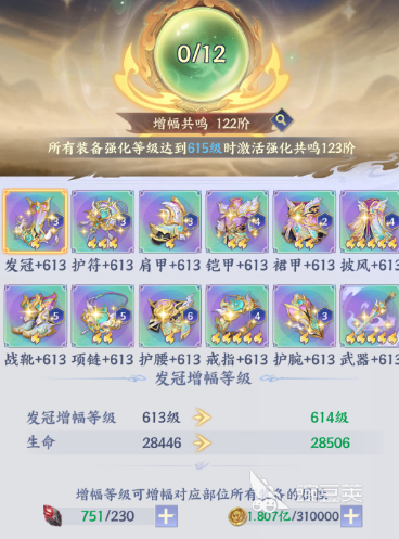 要想提升装备的属性,那增幅就是最直接的方法。每一个装备都有独立的征服,消耗增幅石,还有金币就可以提升等级。每提升一级对应部位的装备属性就可以得到增强,例如发冠增幅之后就可以提升生命值。当所有的装备强化等级达到同一个数值时,还可以激活强化共鸣。例如,当全部的装备强化到615级时,就可解锁强化共鸣123阶。获得海量的属性加成,这里就有一个小技巧,优先强化武器还有戒指等输出部位,可以更快的提升斗气。