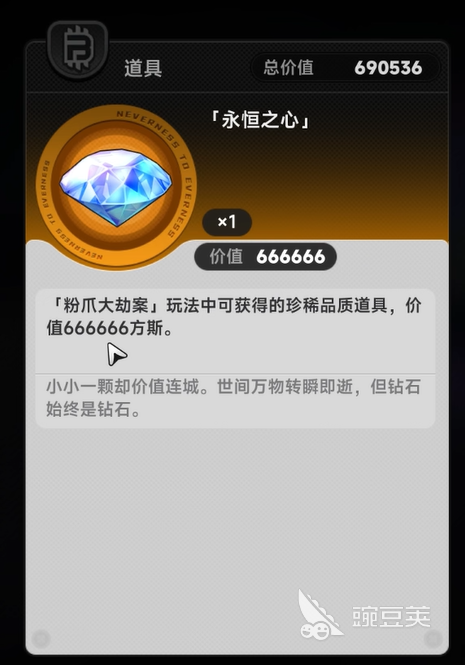 永恒之心是异环游戏里面一件非常稀有的道具,外形看起来就是小小的一颗,但是价值高达666666方斯。光是这个数字,就能让人倒吸一口冷气,在游戏里算得上是顶级的珍贵物品了。道具描述里有句话说得很有意思,世间万物都是转瞬即逝的,但钻石始终是钻石。这颗小东西虽然体积不大,但放在背包里的分量可不轻。很多玩家见到它第一反应就是,这东西怎么可能这么贵,但真正了解过之后就明白了,稀罕的东西自然就值这个价。