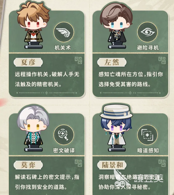 夏彦精通古代机关术,可隔空触发高危区域内的联动装置;左然具备亡魂感知力,能实时标示阴气聚集点,辅助规划安全行进路径;莫弈擅长古文字考据,可快速解析石刻、陶文、青铜铭文中的关键提示;陆景和拥有空间洞察天赋,可在看似封闭的环境中发现隐藏通道,拓展探索纵深。