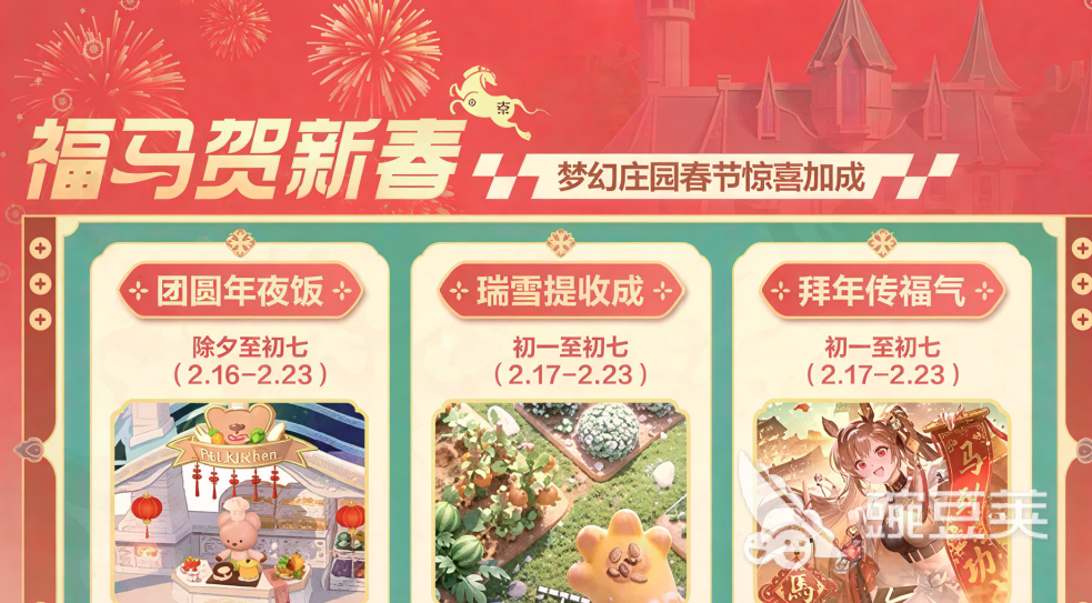 新春版本上线后,游戏主界面将同步启用全新冬日雪景主题背景。该主题包含多个动态雪景场景,支持自由切换,部分场景需通过商城购买解锁。紧随其后的是除夕限定“梦幻烟花秀”——活动仅开放于农历腊月三十当晚,届时梦幻庄园上空将上演持续数分钟的全景动态烟花表演,光影流转,节日仪式感十足。