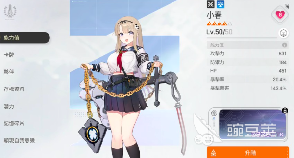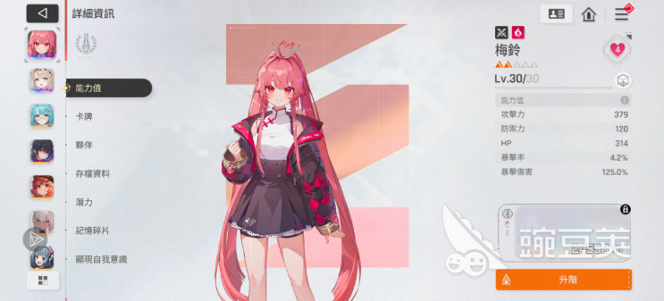 第一种方法非常简单,玩家可以直接进入到角色系统当中,能够直接在能力值区域内了解角色的等级和星级指数,而且还可以查询到卡牌、伙伴、存档资料、潜力等多方面内容;除此之外还可以对角色进行养成提升,了解角色的攻击力、防御力、HP、暴击率、暴击伤害等多种养成系数。