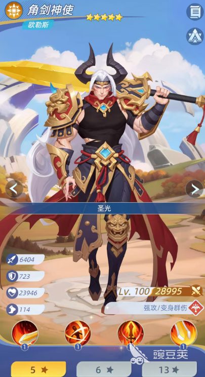 阵容里面大家首先可以放一个角剑神使作为强攻,他的技能破军可以对所有敌人造成100%物理伤害,造成伤害的5%的数值将转化为自身生命值,后期的伤害将提升到140%,造成伤害的45%将转化为自身生命值,并减少目标25%怒气值,所以这里他的群体伤害是有不错的怒气抑制效果的,另外在天神下凡这个技能当中,大家也可以看到他在生命值低于50%时会变身成为持铭剑神,并解除身上之前有的控制,驱散身上所有的负面状态之后还会回复自身20%生命值,对己方所有圣光类型英雄单位附加圣光号令的效果,持铭剑神状态期间他带来的20%伤害减免是一直存在的,所以角剑神使在这里是可以给整个圣光队都带来提升效果的。