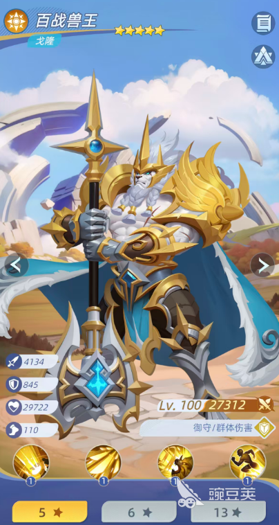 而在前排的位置上面大家可以用的是百战兽王戈隆,他后期可以提升的群体伤害空间还是比较大的,并有50%概率附加伤害降低的效果,释放前百战兽王自身暴击率提高20%,普通攻击变为对敌方全体造成40%的伤害,并有40%概率附加减速,当他受到对面致命伤害之后,就会以生命上限20%的生命值达成复活的条件,并且在此时给自己带来攻击提升的状态,虽然只有15%的提升但是也比没有强一些。