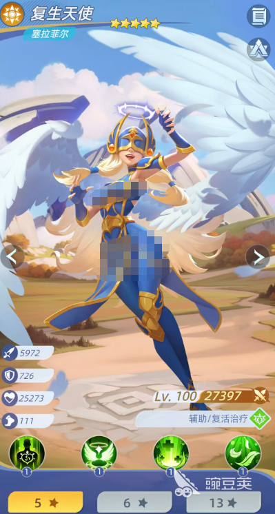 另外的位置上面大家可以搭配一个复生天使,这个角色在当前的圣光队当中还是非常出名的,至少在一般的复活队当中都会带上她,她也是确实是圣光队当中辅助比较好用的角色,还可以给复活的生命值提升到308%,后期在恢复角色的生命值提升到441%之后,她还可以同时附加伤害减免的能力,并额外清除生命比例最低的目标身上的3个减益效果,回合结束时,她还可以为己方生命最低3个目标恢复等同攻击力68%的生命值,所以这里的回复效果还是非常全面的。