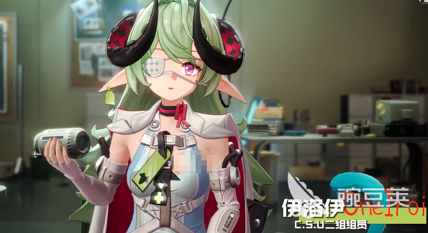 然后是伊洛伊,这个角色外观看起来年龄不大,整体的人物制作也比较符合低龄化的视觉表达,她胸前的十字标记看起来是比较像一个治疗类型的角色,但大家不用以为她是传统的奶妈角色,因为她的定位更特殊,游戏中伊洛伊的名字源自北欧梦境神祇,再加上她头上的恶魔角和脸上的遮眼布设计,能看出她的异能偏向幻境类的效果,所以很多玩家预测她的能力是可以给敌人施加睡眠、混乱或者命中率下降之类的群体减益,既能辅助续航,又能打软控的话她就是后期强度很高的一类多功能支援角色,就是不知道这个角色是否会这样制作。