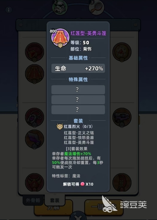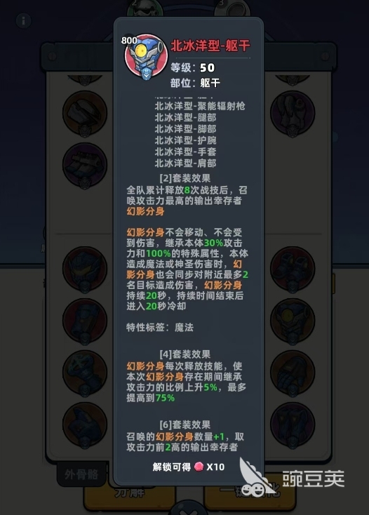 而在其它搭配上,可用北冰洋六件套和擎天型二件套作为外骨骼的外圈配装,擎天型二件套可让玩家获得能量块,以此获得高倍率的物理增伤,北冰洋六件套的幻影分身效果,可有效地强化幸存者的输出,对主打物理或神圣伤害的幸存者能带来极大的提升,与天际砖头无比适配。至于内圈更适合用红莲型三件套,它有50%的概率在幸存者释放战技后立刻重置冷却,且每3秒就触发一次,让幸存者能更频繁地打出物理或神圣伤害,从而更快地完成激发天际砖头所需的前置条件。