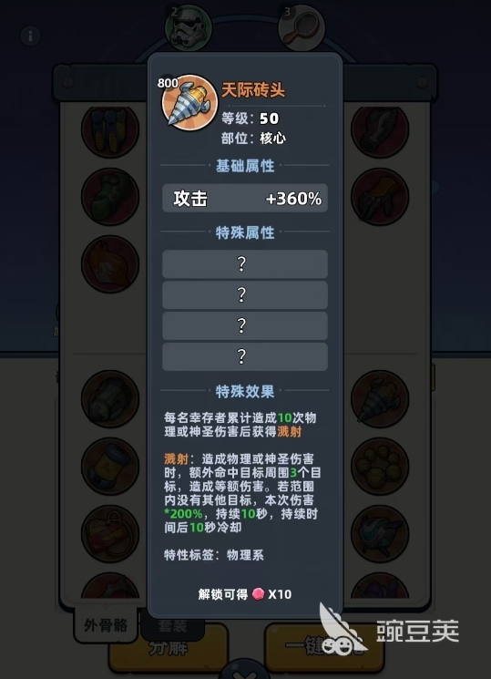 但要知道,天际砖头是最低品质为橙品的外骨骼核心,所以它在前期无法获得,只有将秘境试炼通关至61层后,才能解锁天际砖头的掉落。因此,在外骨骼核心的选择上也分为两个不同的阶段,若玩家们的主力幸存者主打物理或神圣伤害,那边便可在秘境试炼61层之前,使用任意高数值的核心来过渡,等自己能打过秘境试炼61层并获得天际砖头,只用天际砖头作为自己在外骨骼核心上的唯一选择。