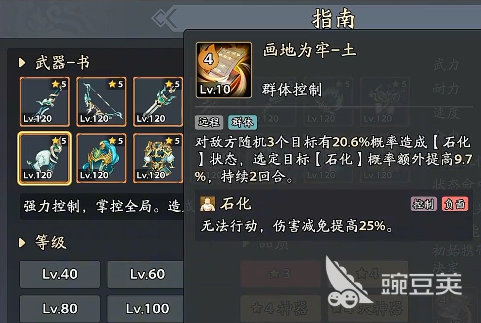 装备书类武器后,玩家能获得画地为牢技能,该技能随机选择敌方3名目标,并向他们施加石化状态,被石化的目标在解除石化之前无法进行任何行动,控制效果显著,适用多种场合。