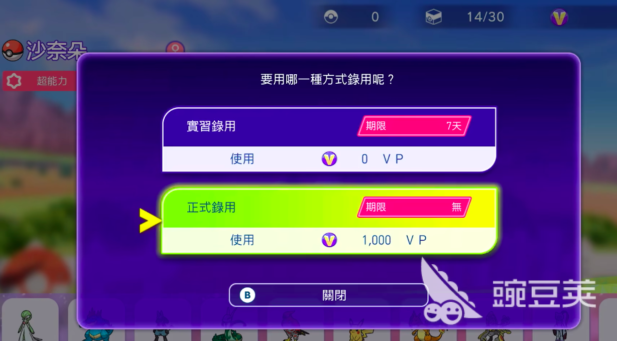 首先先来了解一下“录用系统”,使用该系统可以让你心仪的宝可梦成为你的专属作战宠物,想与哪一只宝可梦,并肩作战全部由你自己决定,目前录用模式分两种,一种是“习惯录用”,另一种是“正式录用”,习惯录用,一般录用时长为7天,不花费vp;如果想让宝可梦长时间陪伴你作战,那么就选择正式录用,此时就可以永久获得这只宝可梦,不过需要花费1000vp,之后进入兑换系统就可以将你永久获得的宝可梦编入战队,开启热血战斗了。