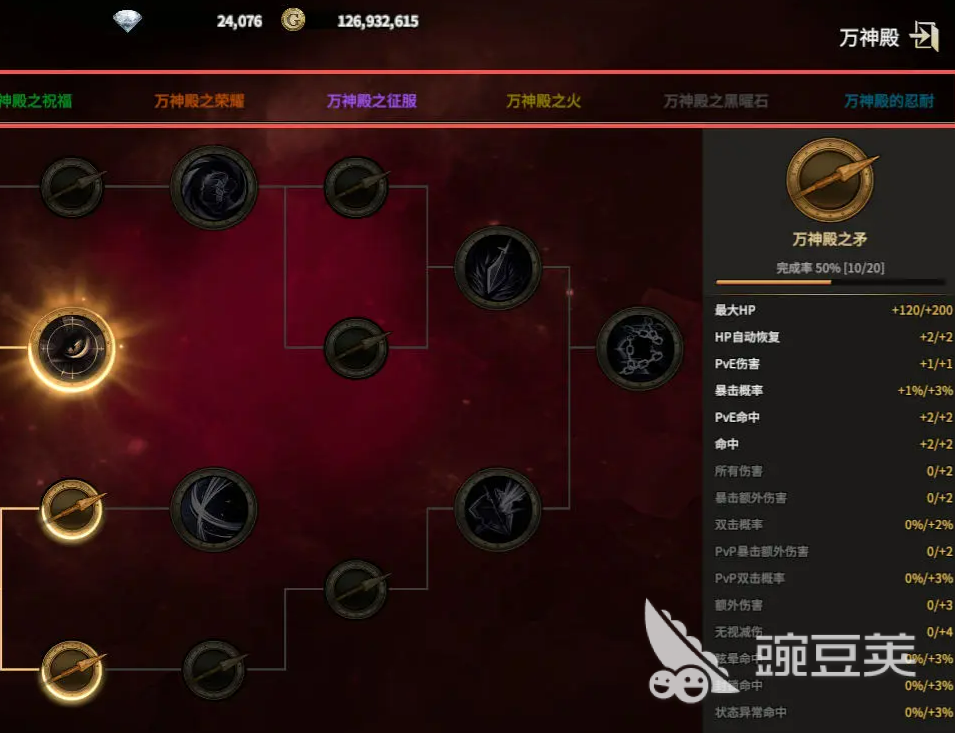 路径选择共设七条独立分支,各具功能定位。新手期推荐优先集中资源发展“万神之矛”与“星星之火”两条路径:“万神之矛”提供全伤害加成及PVP专项增益,“星星之火”强化输出能力,二者协同可快速构筑主力输出体系,为后续副本攻坚与竞技场对抗奠定基础。生存向玩家可适时投入“万神殿头盔”,其抗性与减伤属性有效提升容错空间。注重日常效率的用户宜关注“万神殿祝福”,该路径的经验获取加成、负重上限提升与技能冷却缩减,对挂机发育与等级追赶具有实质助益。其余如“万神殿荣耀”“万神殿之火”“万神殿黑耀”“万神殿忍耐”等路径,多聚焦PVP场景下的特殊机制,建议在中后期根据自身对战需求逐步补足。