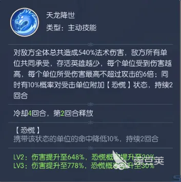 她的主动大招“天龙降世”具备全屏范围打击能力,总计造成540%法术伤害,由当前存活的所有敌方单位共同分摊。这意味着敌方阵亡单位越多,剩余单位承受的单体伤害越高;但每名目标所受伤害上限为龙吉公主自身攻击力的6倍。此外,该技能有10%概率为目标附加持续2回合的“恐慌”状态,处于该状态下的单位命中率降低10%。