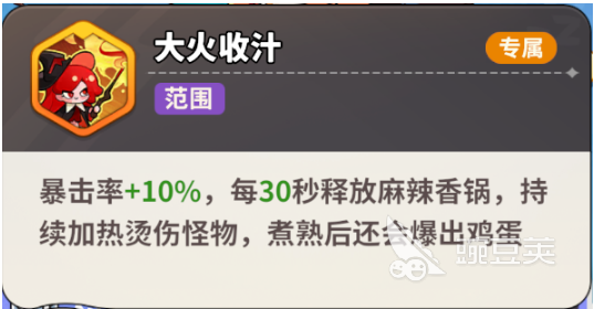 作为专攻大范围持续灼烧的战场法师。他的技能设计还是比较有趣味性的。火鸟冲击这就是一个普通攻击,可以直接发射弹跳鸡蛋,落地之后马上就可以炸开。鸡蛋在梦魇群中会反复的弹跳,然后接连的爆炸,还有多段范围性伤害,可以轻松的收割杂。大火收汁是核心的专属技能,更是一个压箱底的绝活,在解锁之后就会提升10%的暴击率。每30秒的时间就会丢下一个超大的魔法火锅,火锅持续加热就会给周围造成高额的灼伤效果。