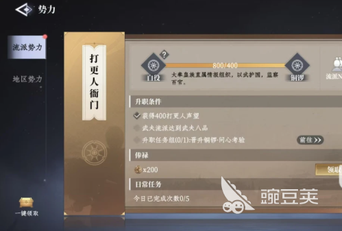 流派势力主要的玩法是晋升,还有日常,就比如说打更人衙门,在刚刚加入时,那只不过是一个白役。在完成日常任务,拥有了400以上的声望之后,然后提升个人的等级,就可以直接升职成为铜锣。每一次晋升都可以解锁新的权限,在流派NPC那边可以学专属的技能,并且每一天还能领取俸禄。日常的任务基本上是一天可以做5次,慢慢就可以积攒贡献,然后稳步的提升,玩法真的还是很有成就感的,也吸引了不少玩家的关注。