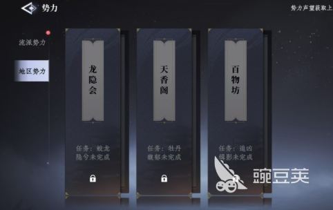地区势力主要是跟着地图去解锁,然后慢慢的增加,一开始可以入的有龙隐会,百物坊,还有天香阁。每一个都有专属的加入任务,如果是选择加入到龙隐会那自然就需要选择去完成蛟龙隐息。做完任务之后就可以开启对应的声望系统,当然这个流派和上面的流派有所区别,地区势力主要是以声望积累作为核心。在完成专属的任务之后,就可以迅速的提升声望,一旦在提升等级之后,就可以在NPC商人那边去兑换各种道具。所以在玩这一个流派时,不要操之过急,只能够选择循序渐进。