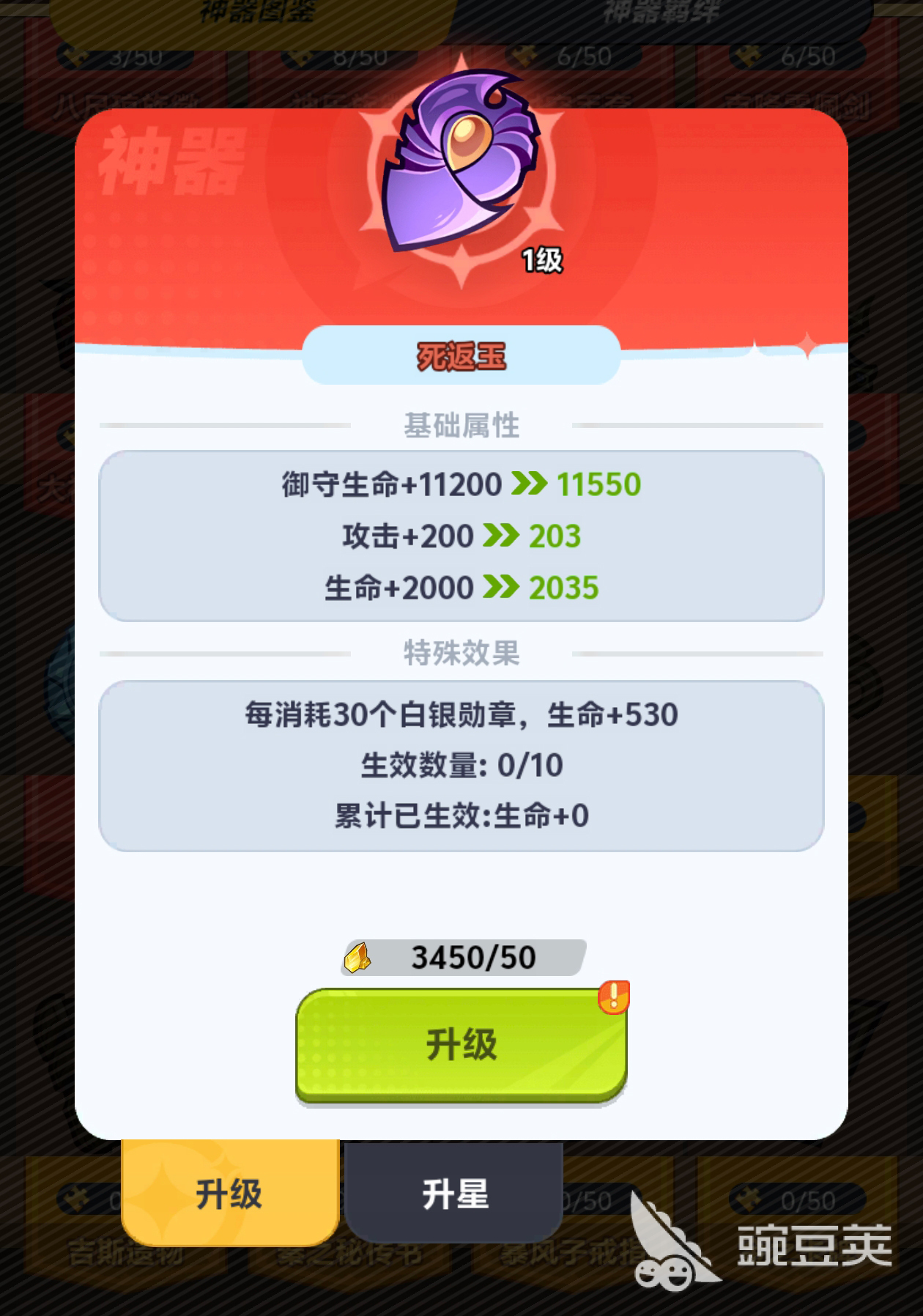 以代表性神器“死返王”为例:基础属性为提升攻击与生命值;特殊效果为每消耗30枚白银勋章,额外增加530点生命值,该效果最多可叠加10层。