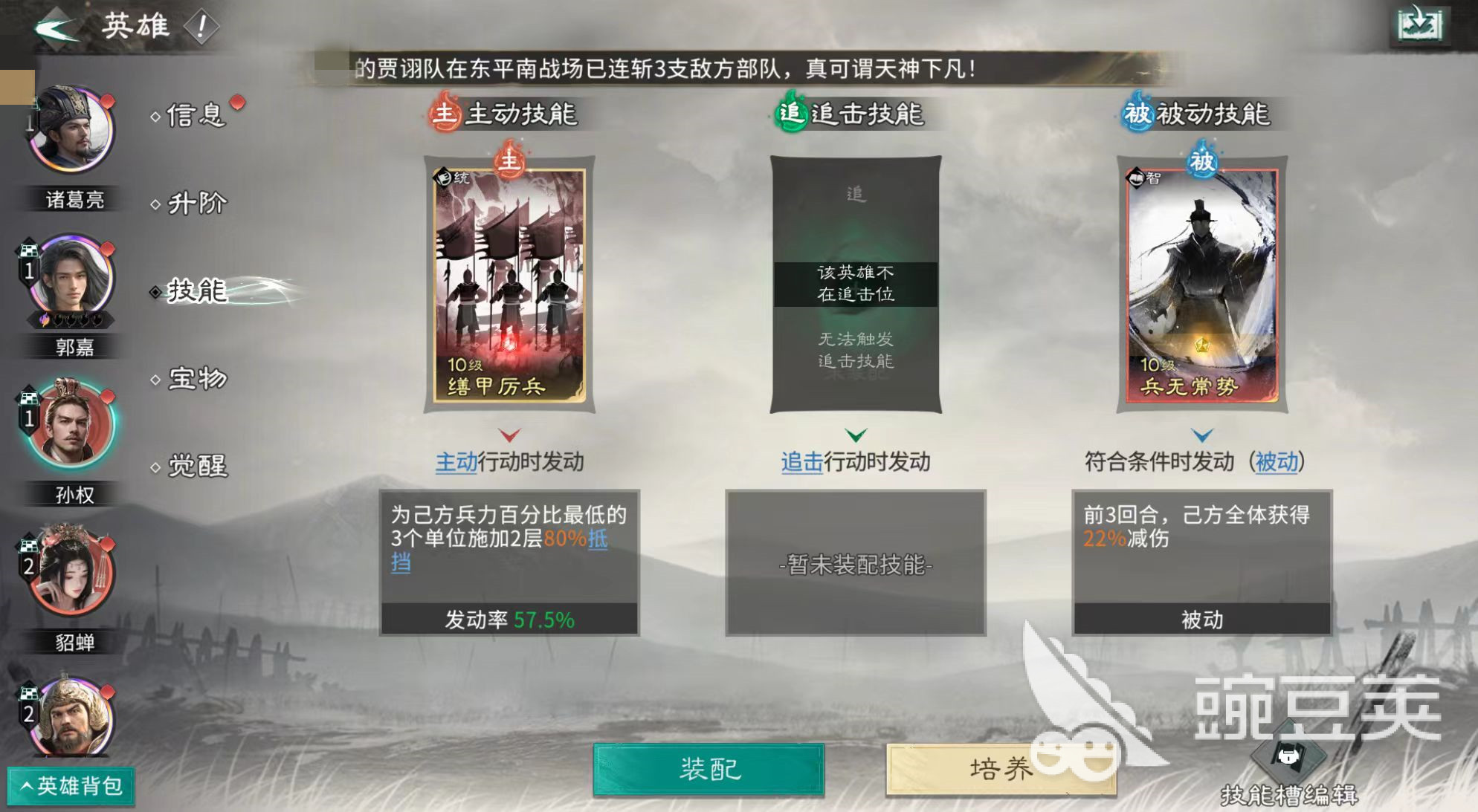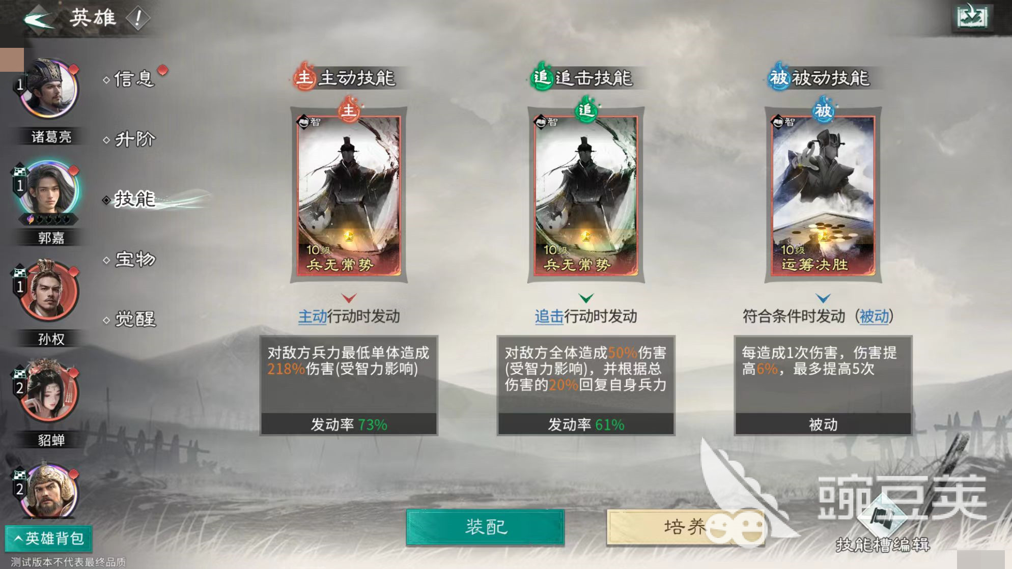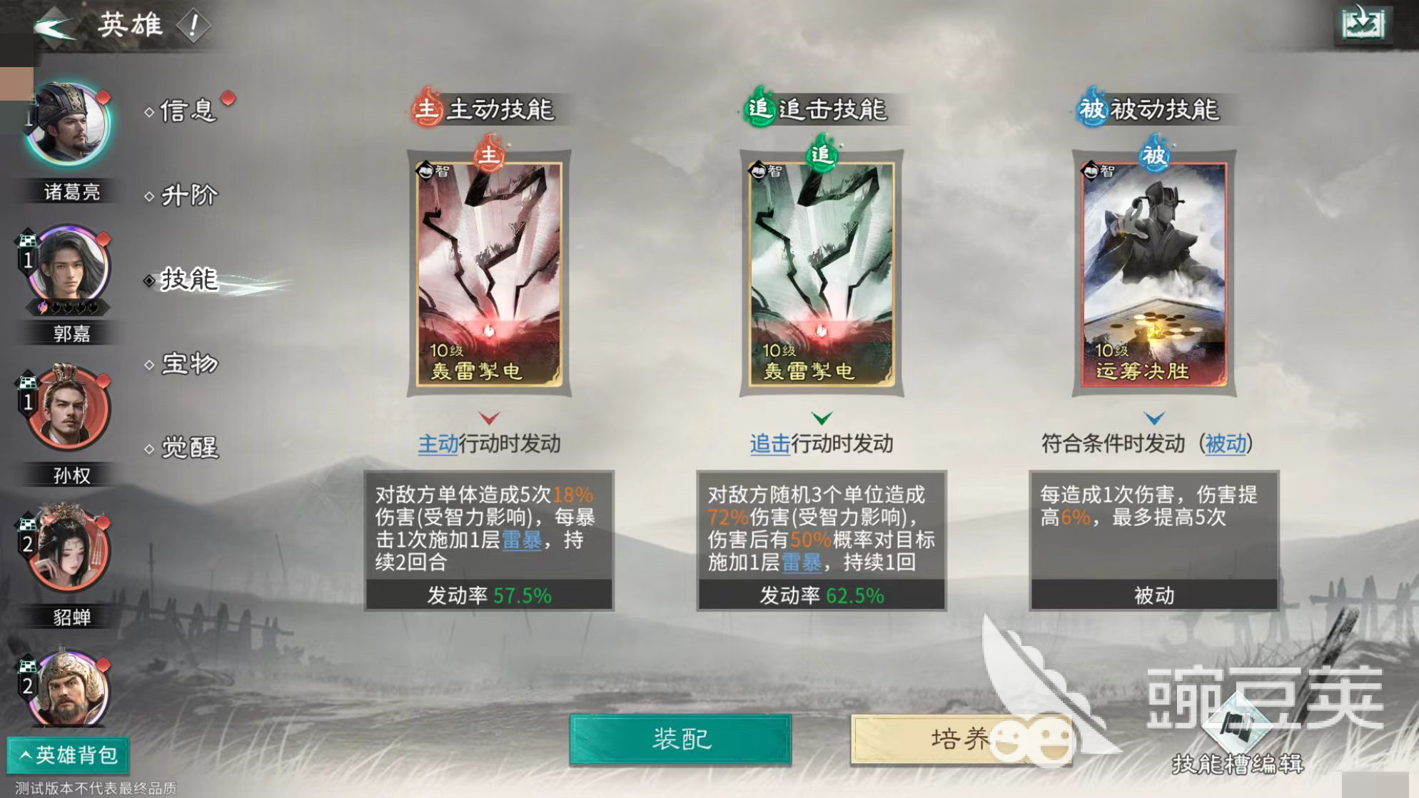 诸葛亮在此体系中承担关键触发器职能:其被动可在敌方释放技能后立即发动智力比拼并造成伤害,配合自身高智力属性,确保拼点胜率,持续为孙权提供响应机会。技能配置方面,诸葛亮携带轰雷掣电与运筹决胜;郭嘉装配兵无常势及运筹决胜;孙权则选择善甲利兵与兵无常势。整套技能组合兼顾控制、爆发与增益,在PVE推图与PVP对抗中均表现出色,具备即用性与稳定性。