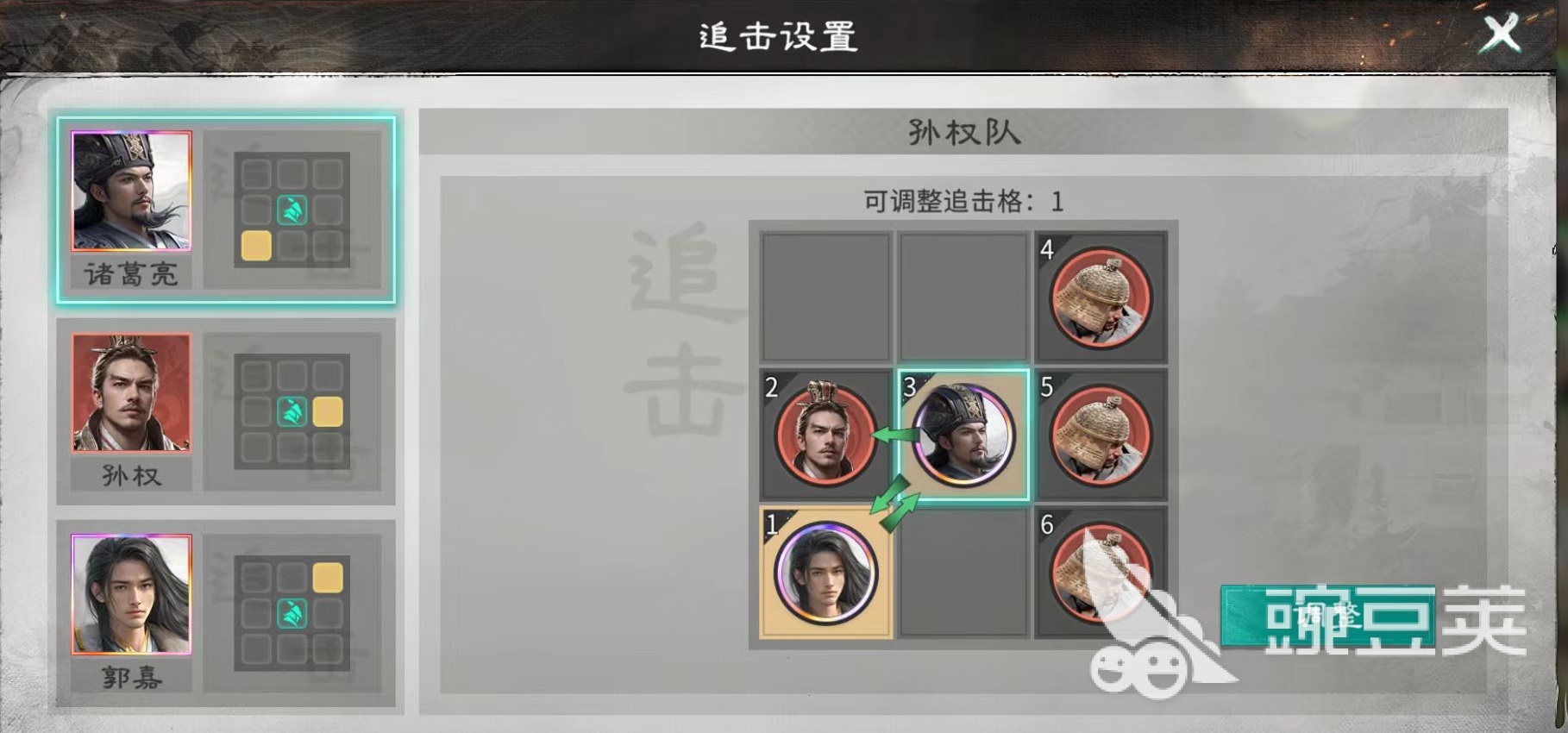 主力武将组合为诸葛亮、孙权、郭嘉,兵种统一选用藤甲兵。布阵逻辑清晰:三名藤甲兵前置承担物理伤害,形成稳固前排;诸葛亮置于孙权与郭嘉的追击格内,郭嘉则精准落位于诸葛亮追击范围,孙权无需刻意调整站位。此布局旨在最大化触发孙权天赋——其被动可为全体友军提升四维属性,并在拼点结果产生时自动响应。郭嘉凭借全服顶尖的智力成长值,几乎可对所有敌方武将发起智力比拼,胜率极高,从而高频激活孙权的伤害或治疗效果。