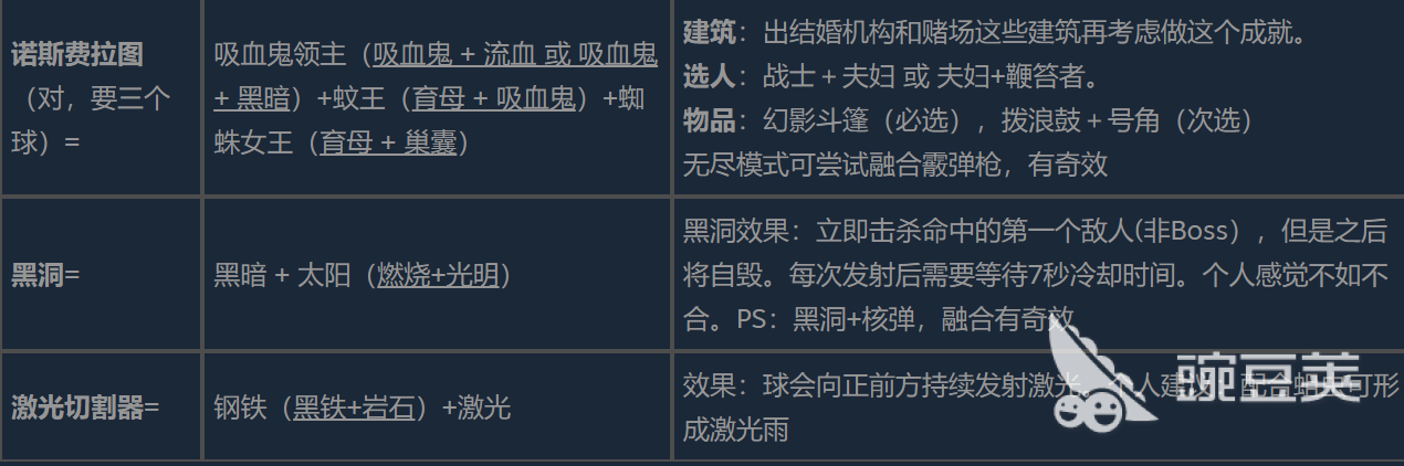 对只求极限单体爆发或者特殊机制的玩家来说,可以用撒旦和诺斯费拉图进行进阶合成。撒旦是由梦魇(魅惑+黑暗)和魅魔(魅惑+吸血鬼)结合而成的,虽然没有具体的文字描写,但是它的组合常常会暗示出强大的控制力和吸血的能力。而更复杂的一个“诺斯费拉图”就是三球融合,即吸血鬼领主、蚊王和蜘蛛女王。该合成对建筑和选人有很高的要求,建议先解锁婚介中心、赌场,并且搭配上战士+夫妇或者夫妇+鞭笞者的阵容,携带幻影斗篷等重要遗物。