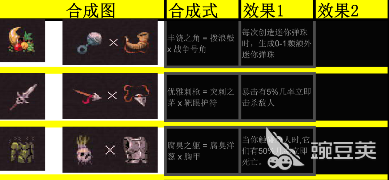 功能型弹珠的合成更看重机制的互补和特化。黑洞是由黑暗和太阳(燃烧和光明)结合而成的,有击溃非BOSS敌人的一击之力,但是代价是自毁和7秒长冷却,适合配合核弹进行定点清除。激光切割器是“钢铁(黑铁和岩石)”和激光相结合,可以连续向前发射激光,配合蛆虫可以形成密不透风的激光雨。除此之外还有丰饶之角(拨浪鼓+战争号角)、优雅刺枪(突刺之茅+靶眼护符)等很多双材合成公式,分别给生成额外迷你弹珠、提高暴击致死率、穿透敌人、超额治疗等强大的被动效果,大大丰富了构筑的多样性。