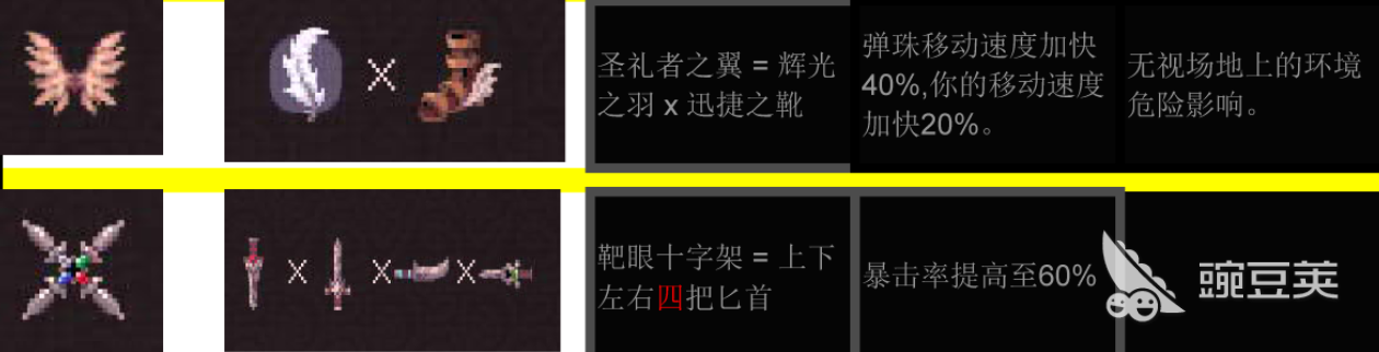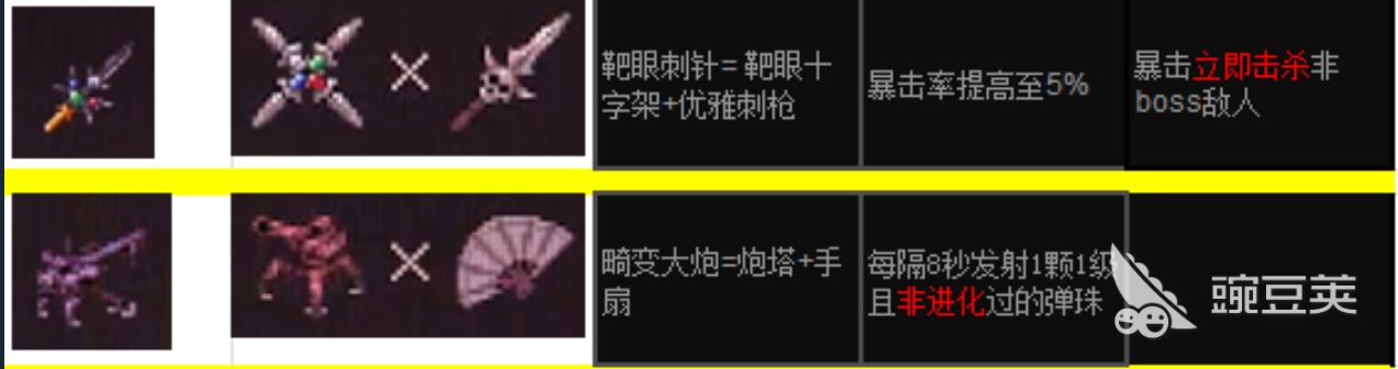 更有一些非常特殊的合成公式,比如“处刑者面具”、“圣礼者之翼”和需要四把匕首合成的“靶眼十字架”,分别给敌人赋予了概率即死、速度大幅度提高、无视环境危险等逆天属性。尤其是“靶眼刺针”和“畸变大炮”这样的高阶合成,用叠加前置组件的方式使暴击率质变、自动召唤攻击弹珠的效果得以实现。