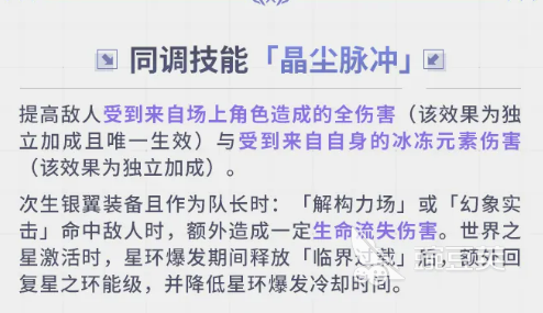 超限武器「苍雷星梭·初号协议」解锁之后,同调技能「晶尘脉冲」会提高敌人受到场上角色的全伤害,这个是独立加成,同类效果只有一个生效。次生银翼装备且当队长时,「解构力场」或「幻象实击」打中敌人,会额外造成生命流失伤害。世界之星激活状态下,星环爆发期间放完「临界过载」,还能额外回复星之环能级,星环爆发的冷却时间也会缩短。