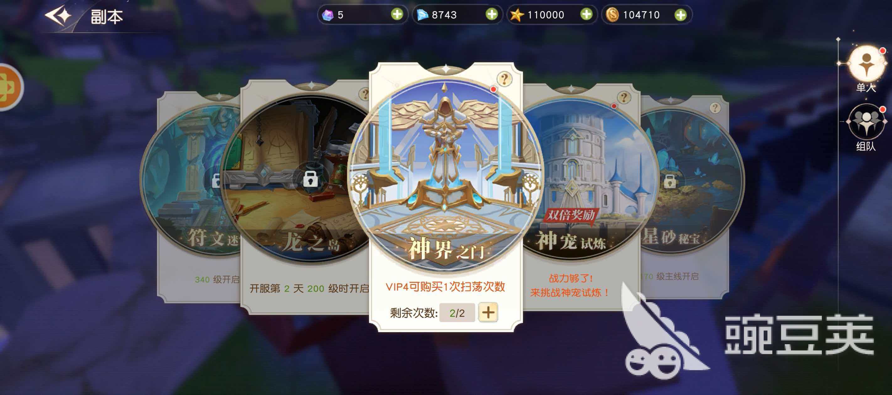星神纪元中的副本有单人副本和多人副本,单人副本一共有5个,分贝是神界之门、神宠试炼、星砂秘宝、龙之岛和符文迷宫,其中神界之门和神宠试炼是在200级以前就会解锁的,至于星砂秘宝、龙之岛和符文迷宫这三个单人副本则需要玩家的等级分别到170级、200级以及340级才行,组队副本一共有三个分贝是妖魔之谷、装备谜境和景石山脉。