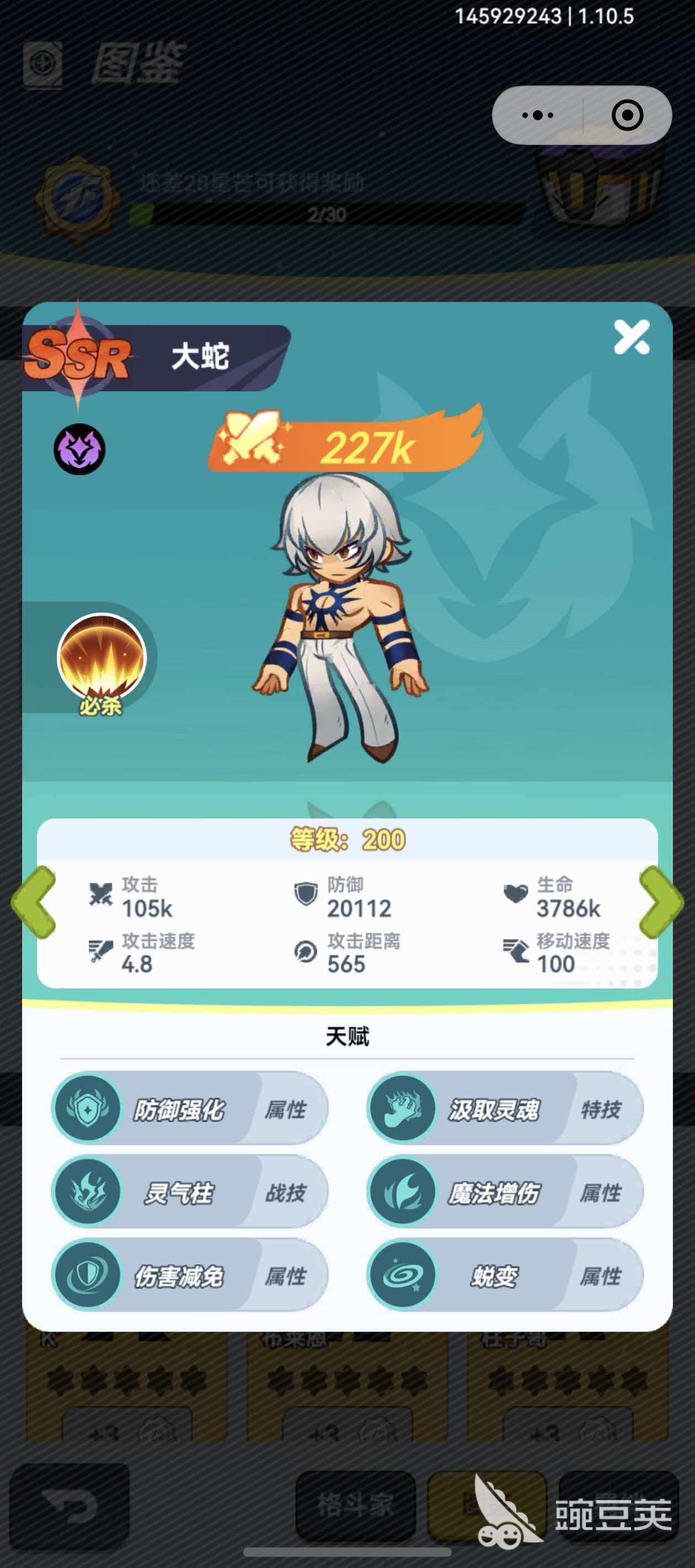大蛇在最强斗王的众多角色中是一个品质为ssr的角色,玩家想要构建法术体系的话,那大蛇绝对是核心角色,战斗时的大蛇不仅有着极高的范围伤害倍率,技能本身更是带有治疗和灼烧两种不同的效果,自身既有能够压制敌人的能力,治疗又确保了自身的续航能力,尤其时她的必杀技阳光普照,这个技能在使用后,大蛇会用阳光照耀整个占城,会给敌人造成6次40%的魔法伤害,技能使用期间还会对敌人所有控制直接免疫。