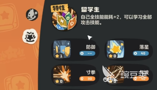 它的专属被动叫"留学生",这个技能设计得挺有意思的,有好有坏。坏的地方是,用任何技能都要多消耗2点能量,能量管理的压力一下子就上来了。好的地方是,它可以学习几乎所有的攻击类技能,技能池非常宽。所以这个被动其实是在说,你想要更多选择,就得付出更高的代价,算是一种取舍。