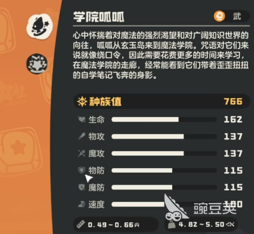 学院呱呱的属性分布,还是挺有意思的。生命值、物理攻击、魔法攻击这三项都处于版本里比较靠前的位置,打起来既能扛也能输出,算是比较全面的类型。物理防御和魔法防御中规中矩,应付普通攻击没什么问题,但速度这一块确实拖了后腿,遇到速度快的对手容易被抢先手,这点要注意。