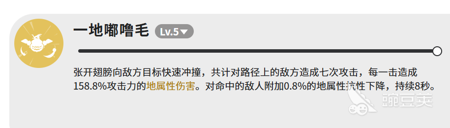 先说它的主力技能,叫「一地嘟噜毛」,满级是LV.5。技能描述是张开翅膀冲向敌方,在路径上一共打七次,每次造成158.8%攻击力的地属性伤害。七次叠加下来,伤害总量其实相当可观。而且每次命中,还会给敌人附加0.8%的地属性抗性下降,持续8秒。单次0.8%看起来不多,但七次全中的话,就是5.6%的抗性削减,对地属性队伍来说,是个不小的增益。这个技能的使用节奏很重要,冲撞路径,要尽量对准敌人密集的位置,这样七次攻击,才能尽量全部命中。