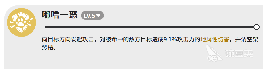 最后一个技能是「嘟噜一怒」,同样LV.5。向目标方向发起攻击,命中后造成9.1%攻击力的地属性伤害,同时清空敌方的架势槽。9.1%的伤害倍率很低,基本可以忽略不计,这个技能的核心价值,完全在于清空架势槽这个效果。架势槽清空,意味着敌人的某些状态,或者防御机制会被打断,配合队伍里其他输出角色使用,能打出不错的连携效果。