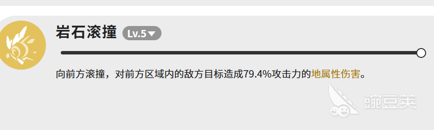 然后是「岩石滚撞」。这个技能比较直接,向前方滚撞,对前方区域的敌人,造成79.4%攻击力的地属性伤害。伤害倍率比「一地嘟噜毛」低不少,但胜在范围覆盖,适合用来清理聚在一起的小怪,或者在主技能冷却的时候补刀用。