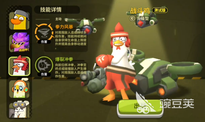 战斗鸡属于游戏里的先锋角色,系统会直接赠送给玩家,不需要通过其他的方法获取,挑战过程中可以操控角色,冲锋在队伍最前面,角色在游戏里主打近距离对抗,想让角色打出更高伤害,就要和对手保持较近距离,角色在游戏里有两项技能可以使用,触发普通技能的时候,角色会直接向前快速位移,位移过程中角色会变换成冲拳的方式,一直到碰撞到对手之后,角色位移才会结束,每次碰撞除了基础伤害之外,还会产生爆炸伤害,周围如果有其他敌人的话,同样也会受到额外附加伤害。