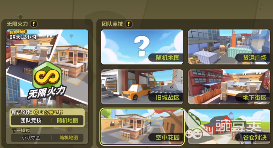 挑战开启之后可以选择的模式很多,模式主要分成限时模式和常驻模式,在限时模式中,系统会推出不同玩法,比较有代表性的模式就是无限火力,玩家不用担心子弹用完,在限定时间内可以无限攻击对抗,常驻模式是游戏最经典的玩法,分成团队竞技和小队夺金,团队模式里会有6张地图可以选择,5张是固定地图,还会有一个随机地图,小队夺金相对来说会更有挑战性,成员们需要一起在游戏里夺取金币奖励。