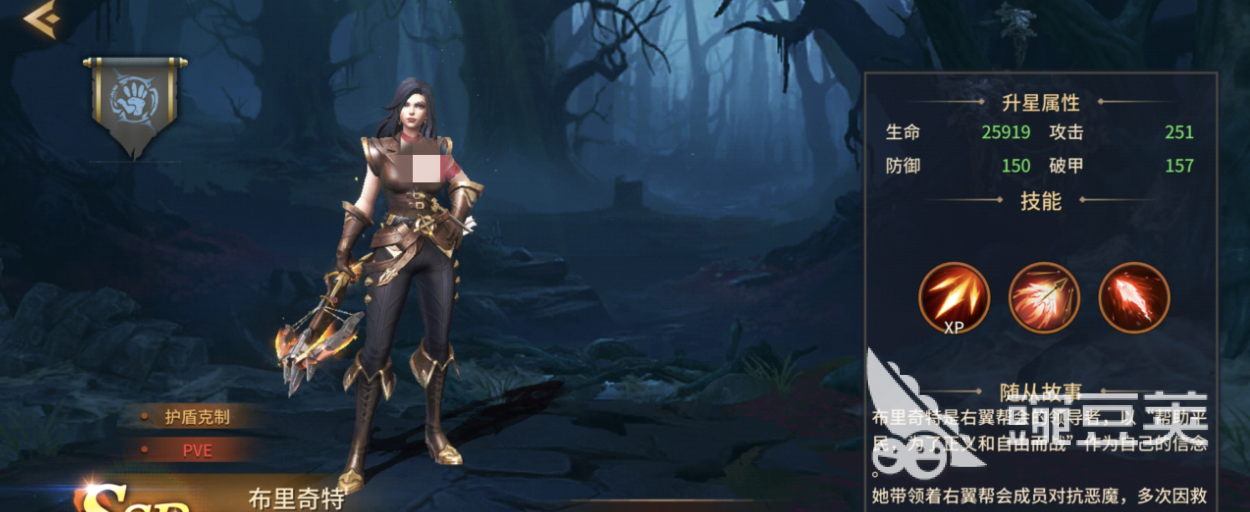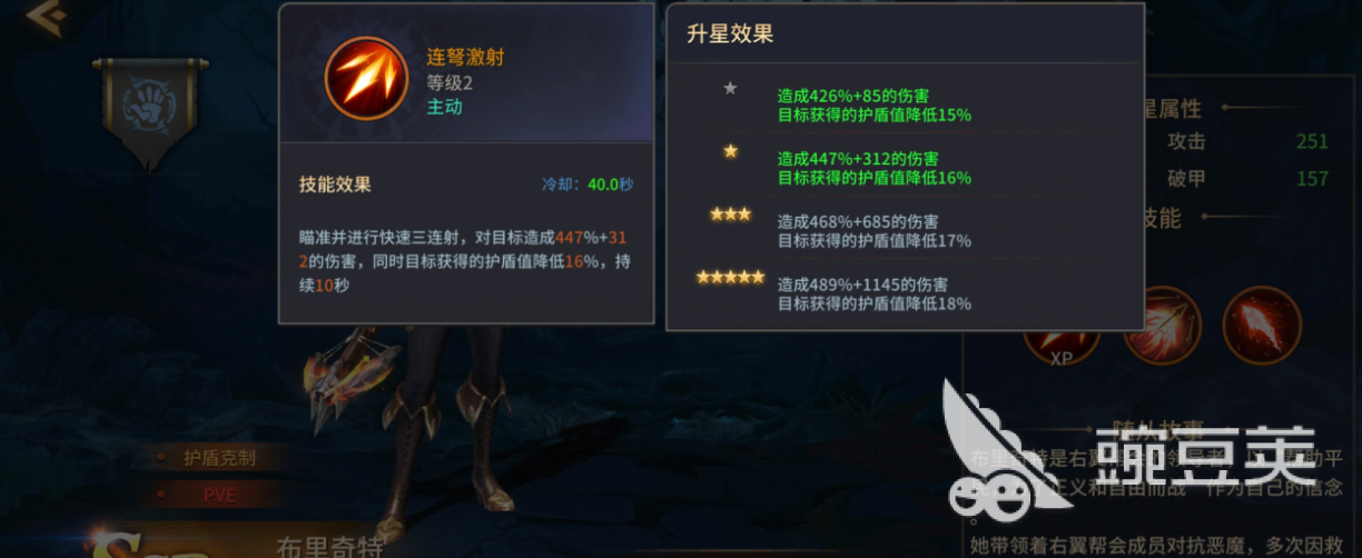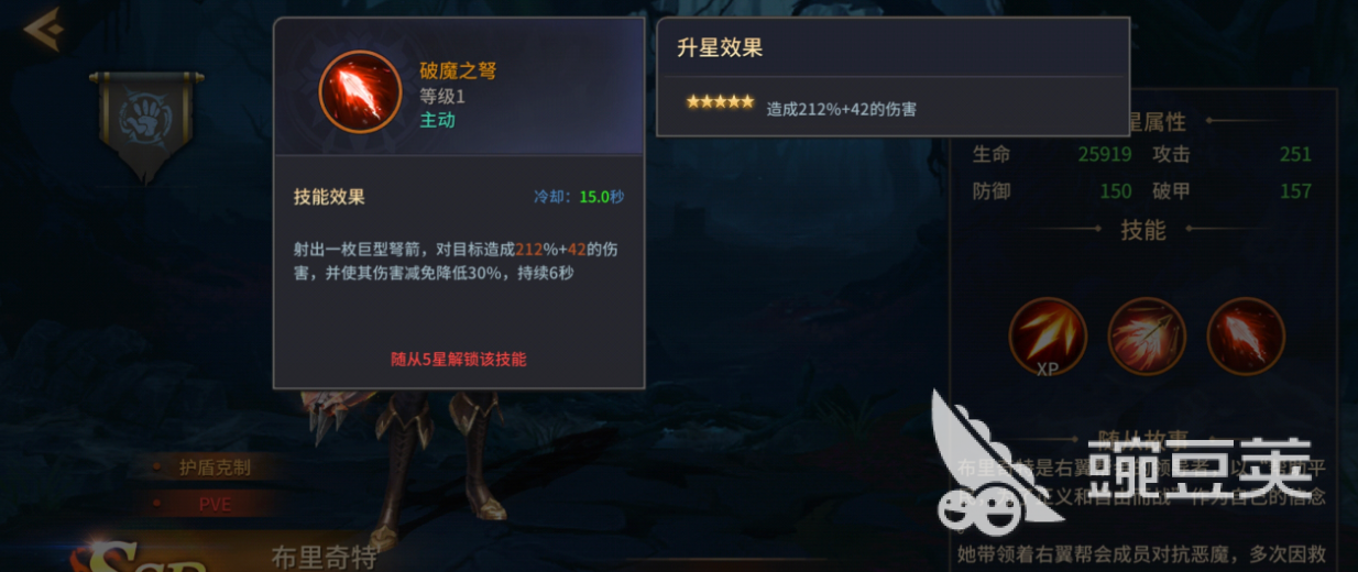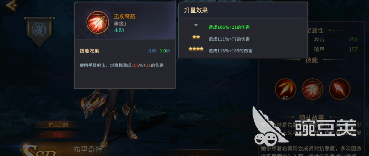 核心爆发能力就是她的二技能“破魔之弩”。这是必须要手动释放的强技能,射出大弩造成大量伤害,使目标防御降低30%,只能在5星级时解锁。减防机制把全队后续伤害输出放大了,使布里奇特不只是一个独立的射手,更是可以撬动整个团队伤害上限的一个杠杆。Boss战关键时及时使用该技能就会立即扭转局势,将战斗引导到胜利一方。