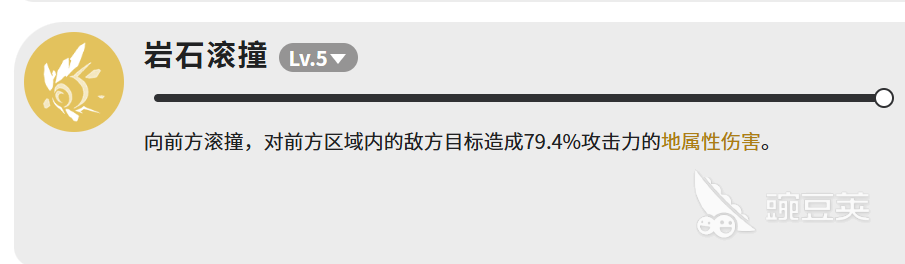 第三个是岩石滚撞,等级5造成79.4%攻击力的地属性伤害,向前方滚过去,打前方区域的敌人。伤害倍率在四个技能里算低的,但地属性输出本来就是辅助雷属性的,这个技能主要是补充地属性伤害,顺带打一下范围。