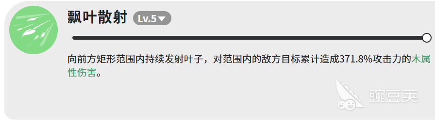飘叶散射这个技能,范围是前方的矩形区域,持续往里面发射叶子,累计伤害能到371.8%攻击力的木属性伤害。这个技能的特点是持续输出,不是一下打完,而是一段时间内不断造成伤害。对付聚在一起的敌人效果比较好,单体的话也能打,就是要保证目标在范围内别跑出去。