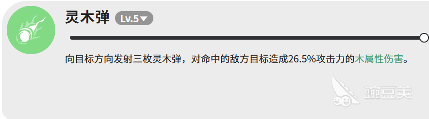 灵木弹相对简单一些,向目标方向发射三枚灵木弹,每枚命中造成26.5%攻击力的木属性伤害。三枚加起来也有将近80%的伤害,而且是分开命中的,有时候打多个目标也能分散打到。这个技能更多是用来补刀或者填空档的,节奏快的时候穿插进去用。