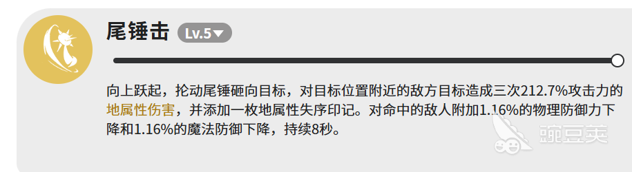 技能方面,铁球蜥一共有三个技能,分别是尾锤击、岩锥和铁球冲撞。尾锤击是铁球蜥最核心的技能,没什么好说的,优先级最高。这个技能的动作是跳起来,然后把尾巴上的铁球抡下去,砸在目标附近的范围内。伤害是三段,每段212.7%的攻击力,地属性,打完还会给目标加一枚地属性失序印记。除了伤害,命中之后还会让敌人的物理防御和魔法防御各降低1.16%,效果持续8秒。三段伤害加起来总倍率超过600%,这个数字在幼年期里算是相当高的了。失序印记和双防下降叠在一起,后续队友跟进输出的效果会更好。所以这个技能不只是用来打伤害,还有辅助削减敌人防御的作用,战斗里能用就尽量先用。