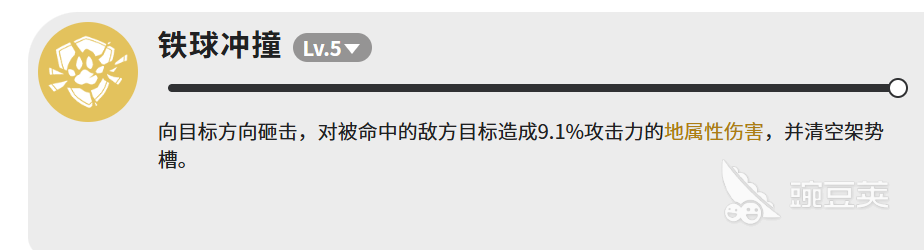 铁球冲撞这个技能比较特殊,伤害倍率只有9.1%,看起来低得有点离谱。但它的重点不在伤害,而是清空架势槽。架势槽在很多战斗里都是关键机制,有些敌人架势槽满了之后会进入强化状态,或者触发某些特殊效果。铁球冲撞能直接清空架势槽,相当于打断敌人的节奏。这个技能的使用时机很重要,不是随便乱用的,要看敌人的架势槽快满的时候再出手,效果才最大。