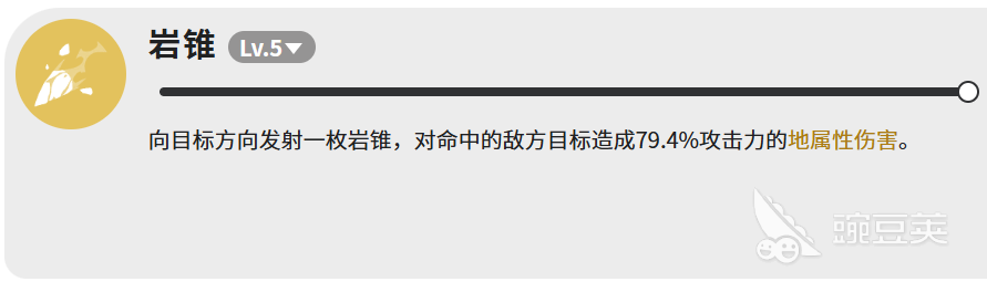 岩锥相对简单一些。向目标方向射出一颗岩锥,命中后造成79.4%攻击力的地属性伤害。倍率不算高,但胜在操作简单,是个稳定输出的手段。尾锤击冷却的时候,岩锥可以用来填补输出空档,保持对敌人的压力。