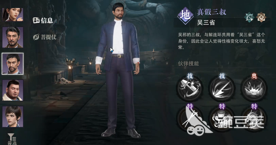 当然了,这个阵容当中最主要的是吴三省,吴三省这个角色一旦获取的话,大家就可以快速的规划起来阵容的组成,因为目前的吴三省是属于稀有度比较高的一个角色,在目前抽卡的。需要资源上面以及关注的效果当中,其实大家只要能够触发羁绊的话,他也绝对是在紫卡里面能够提升上限最高的一个成员,最后这个阵容里面大家还可以考验一下,是否可以让张起灵跟黑瞎子作为核心,这样的话组成的阵容就可以作为一个续航阵容来使用,这个阵容里面的话,张起灵跟黑瞎子放在一起,配合他们有一定物理输出,跟秘术增加的合体能力之后,黑瞎子带来的防御效果也可以让这个阵容当中的前排能力得到一定的反制加强,所以后期在面对一些持久战的副本,比如说公墓守卫之类的副本里面,能够带来的整体效果都是比较高的,更适合参与持久战,那么这样的一个阵容,大家想要进行切换的话,其中可用的成员还是比较多的。