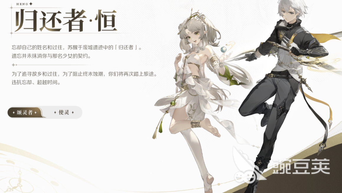 男性主控的名字叫做:恒。从外表上来看,他有着一头银色的短发,身手利落,手持双剑作为武器。恒在游戏中所扮演的身份是归环者,某一天,他从一片废墟中醒来,已经忘记了自己的姓名和曾经经历过的往事,而在他的身边出现了一位少女,也就是恒的使灵。少女与他一样已经什么都不记得了,但是在交谈过后,两人发现相互之间已经缔结了契约,于是在商量过后,决定一起冒险,寻回已经丢失的记忆。